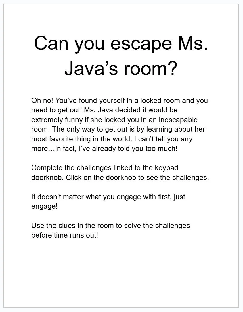 I proposed using gamification and game-based learning to introduce the concept and purpose of coding. Via a game-based learning digital escape room, students would be able to learn what coding is, why people code, and use problem-solving and critical thinking skills as they learn.